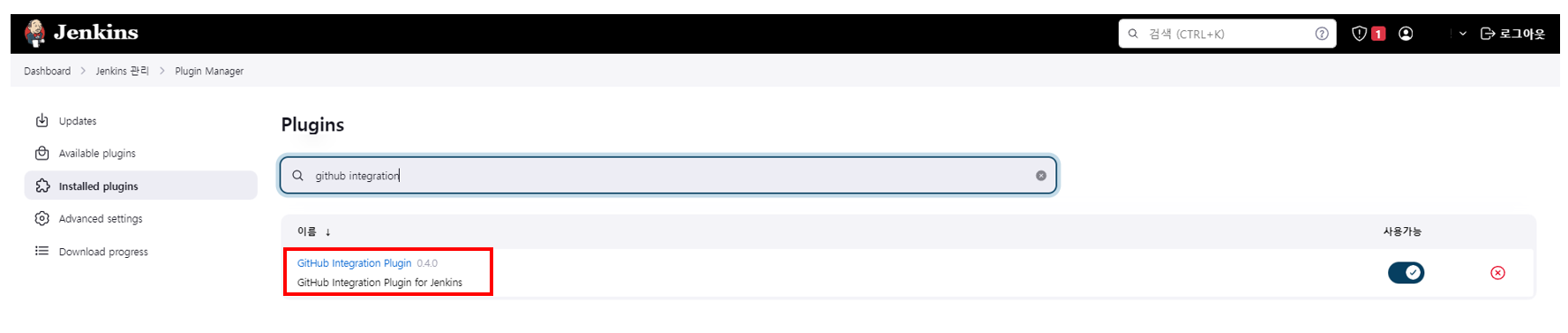 Jenkins 관리 → 플러그인 관리 → github integration 설치
