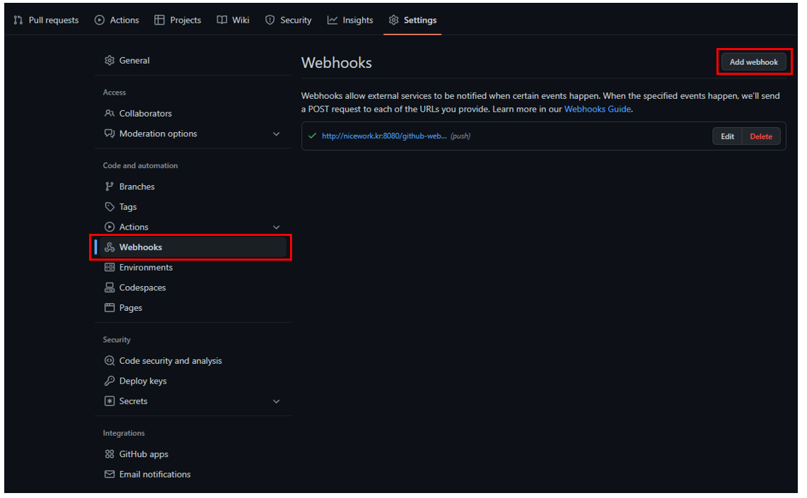 ① Github Repository 프로젝트 Settings → Webhooks → Add webhook